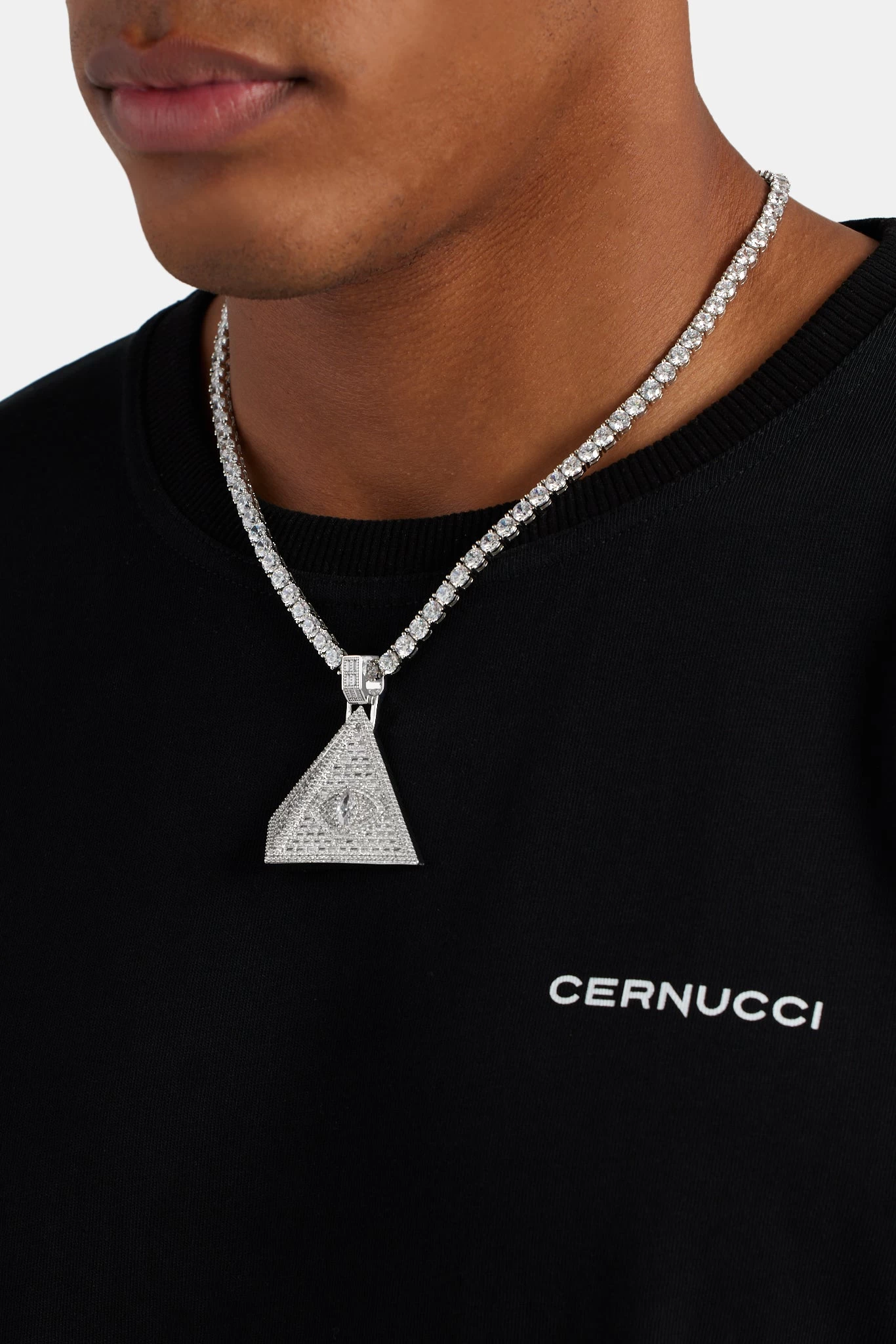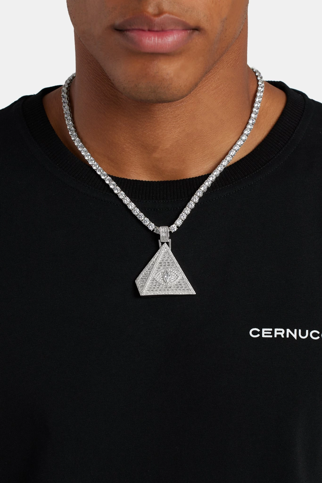 Set your style apart with this stunning 50mm iced baguette CZ pyramid pendant! Crafted with rhodium plating and encrusted with sparkling cubic zirconia stones, this pendant makes the perfect statement. Get ready to shine!
