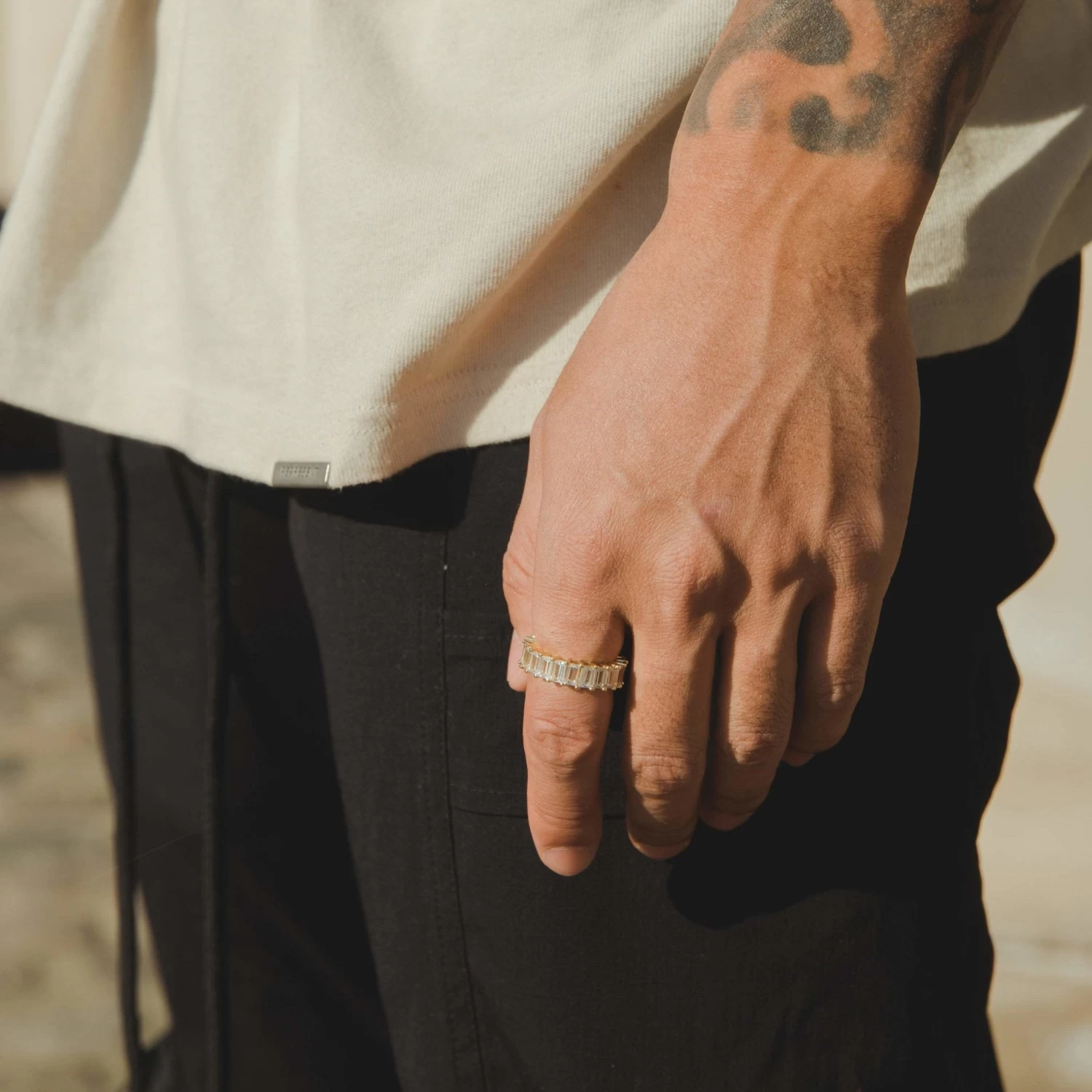 Want to stand out? Cernuccis Baguette Ring is the perfect trend setting piece. The large, 4MM, baguette stones around the band demand respect and attention. Define your look.