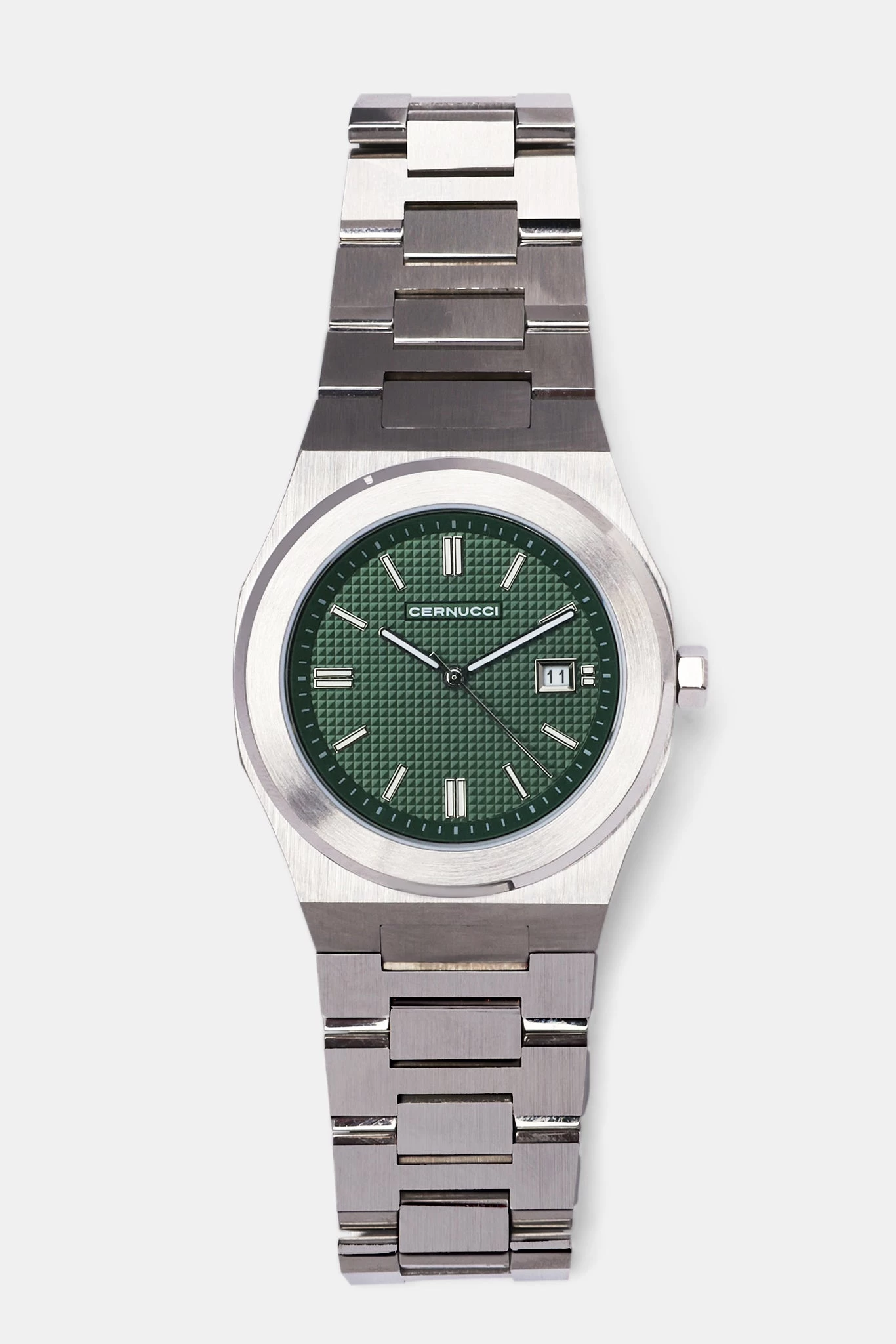 Polished bezel and strap with Cernucci branded emerald green face, water resistant and embossed dial.Â