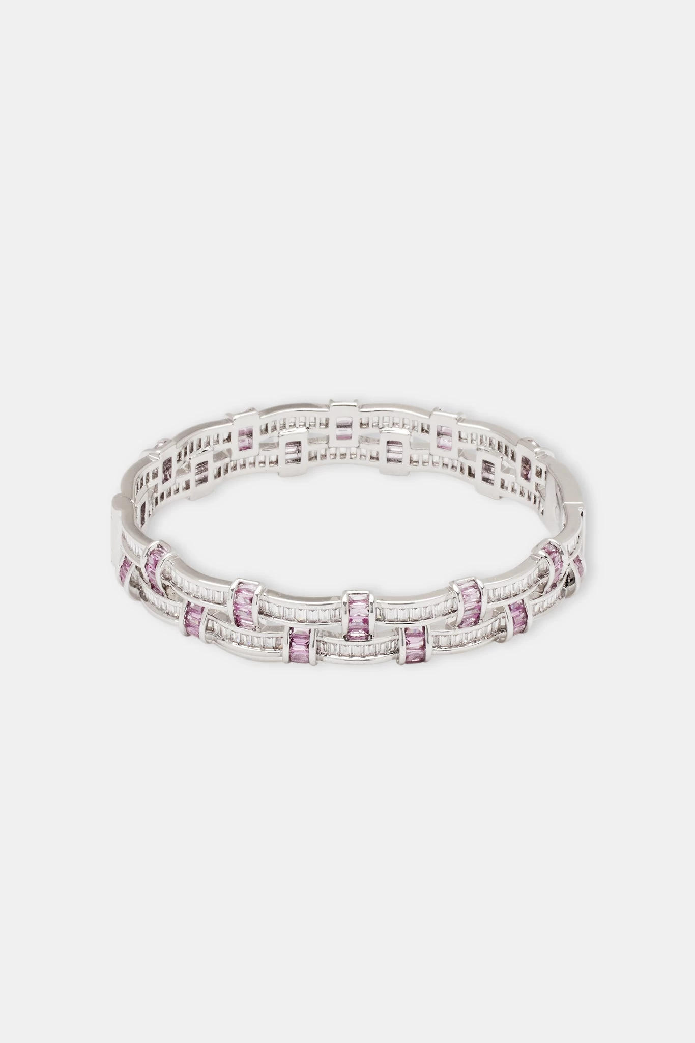 Iced Woven Pink Baguette Bangle goes hard. We made this one to shine from all angles. Stack up or wear alone.